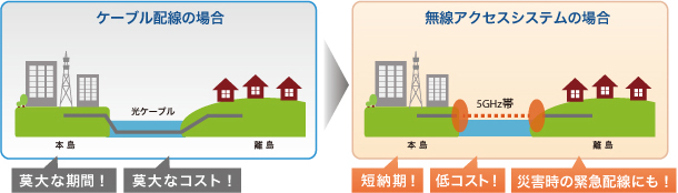 特長1 ケーブル敷設が困難な場所に、低コスト&短期間で無線アクセスシステムを構築。